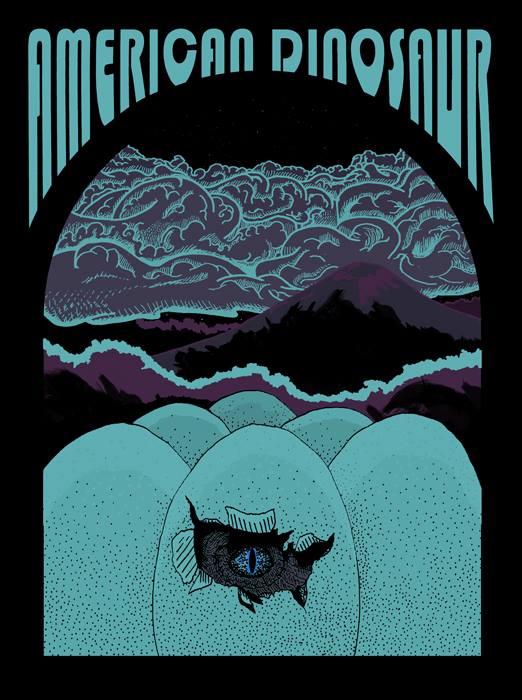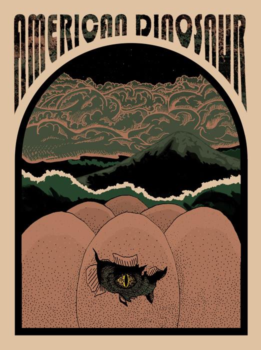 This was a project I was pretty excited about. I got complete creative freedom to do a gig print for American Dinosaur. I had recently been admiring old goosebumps book covers. I thought it would be cool to do something reminiscent of the goosebumps book “Egg Monsters From Mars,” except with dinosaur eggs. I used that as my inspiration and later came up with the idea that the crack in the egg could be shaped like the United States.