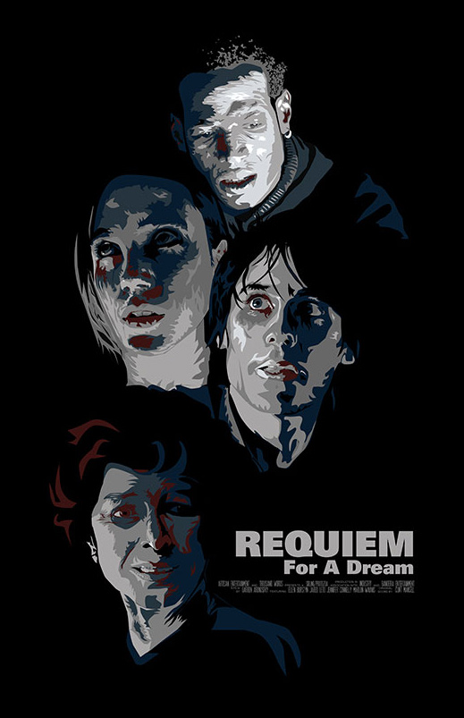This print was another one of my posters for an art show where the central theme was alternative movie and television posters. Requiem for a dream is a favorite of mine, and honestly I really struggled coming up with something clever for this. At the time I was designing a lot of prints with similarity of design, or things that look like other things. Running out of time I decided to use the characters expressions to depict the mood of the movie rather than the plot. I illustrated each of the four main characters in the movie with a chiaroscuro technique, and choose images of them with a sense of dread or uncertainty on their face. Out of all of the prints I had worked on that year this one was the most surprising, because it seemed to be most peoples favorite.